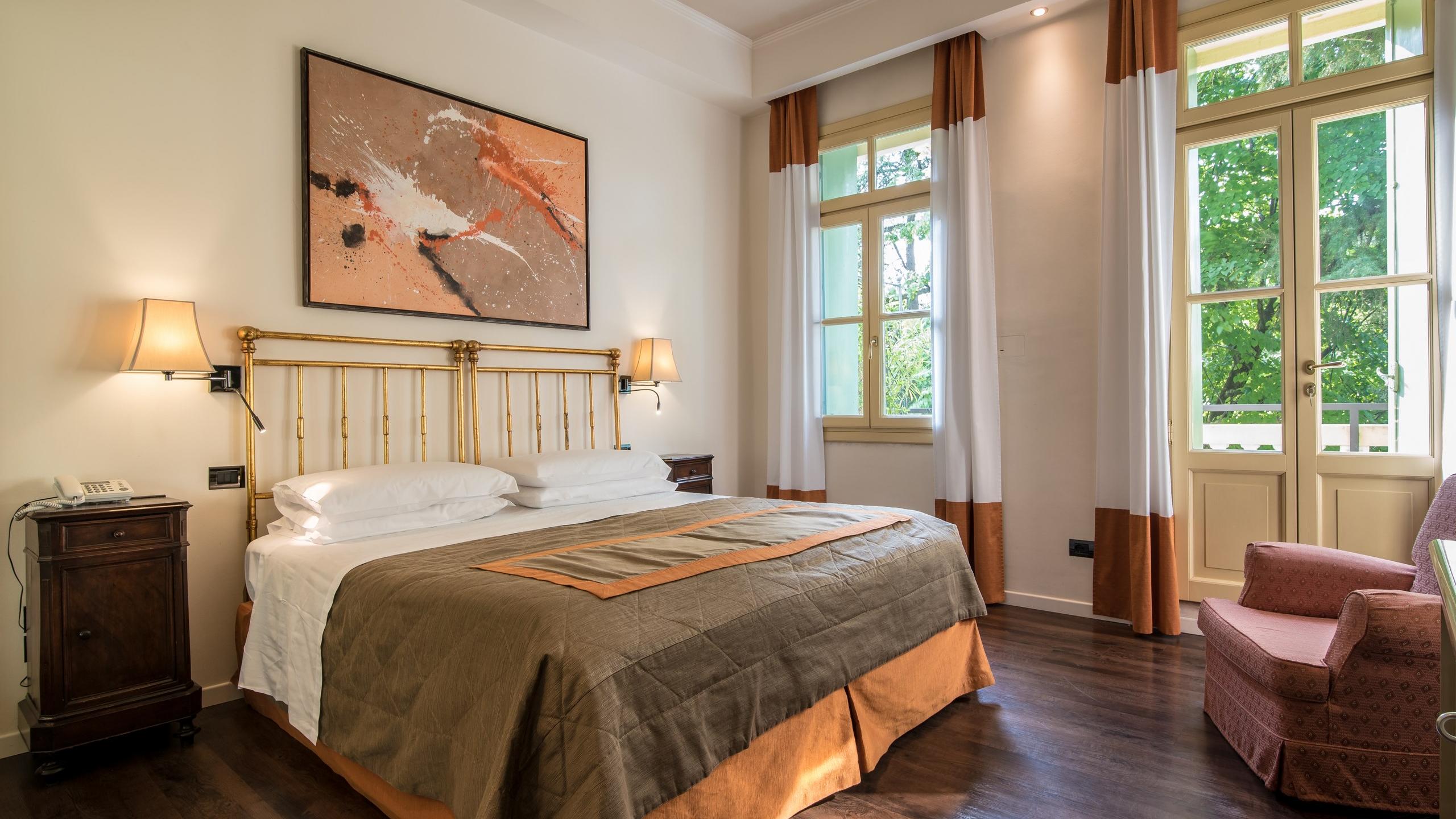 Spacious room with the possibility of adding a third bed for adults and children. It features a balcony and is equipped with all mod-cons: mini bar, safe, LCD TV, air conditioning, radio, telephone, and Wi-Fi. The en-suite bathroom features a private shower as well as a hairdryer and beauty products. Our rooms are unique and different from each other. The one assigned to you may be different from the one in the picture.